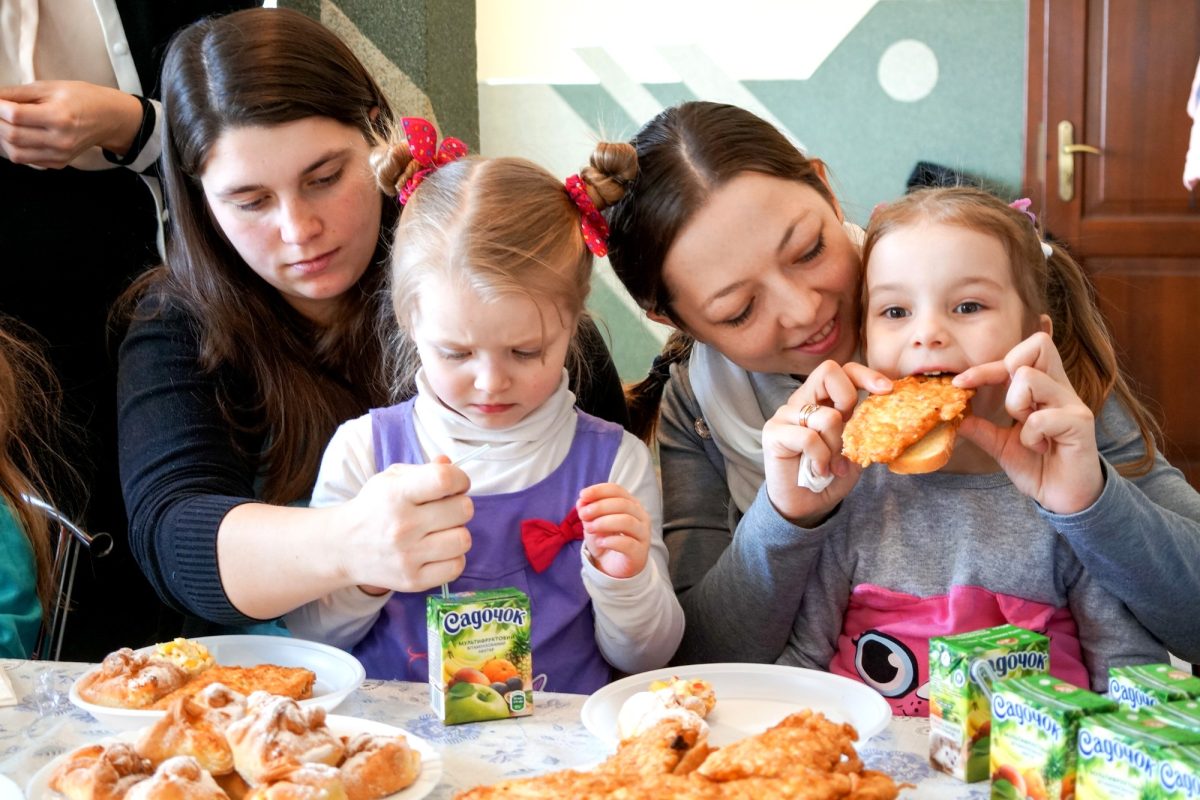 These moms from Ukraine are helping their daughters enjoy a beautiful Easter meal. Thanks to sponsorship and other donations, sponsored families are able to enjoy and celebrate Easter together, an incredibly important holiday in Ukraine. The little girl on the left’s face is all lit up with Easter (and snack time) joy!