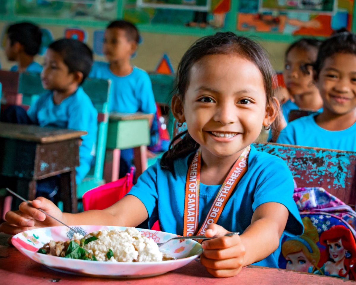 This little girl sure seems happy to be enjoying a delicious school lunch! Students at our Samar site in the Philippines receive school meals courtesy of donors to our nutrition program. Thanks to the healthy meals, they have the energy to learn throughout the school day!