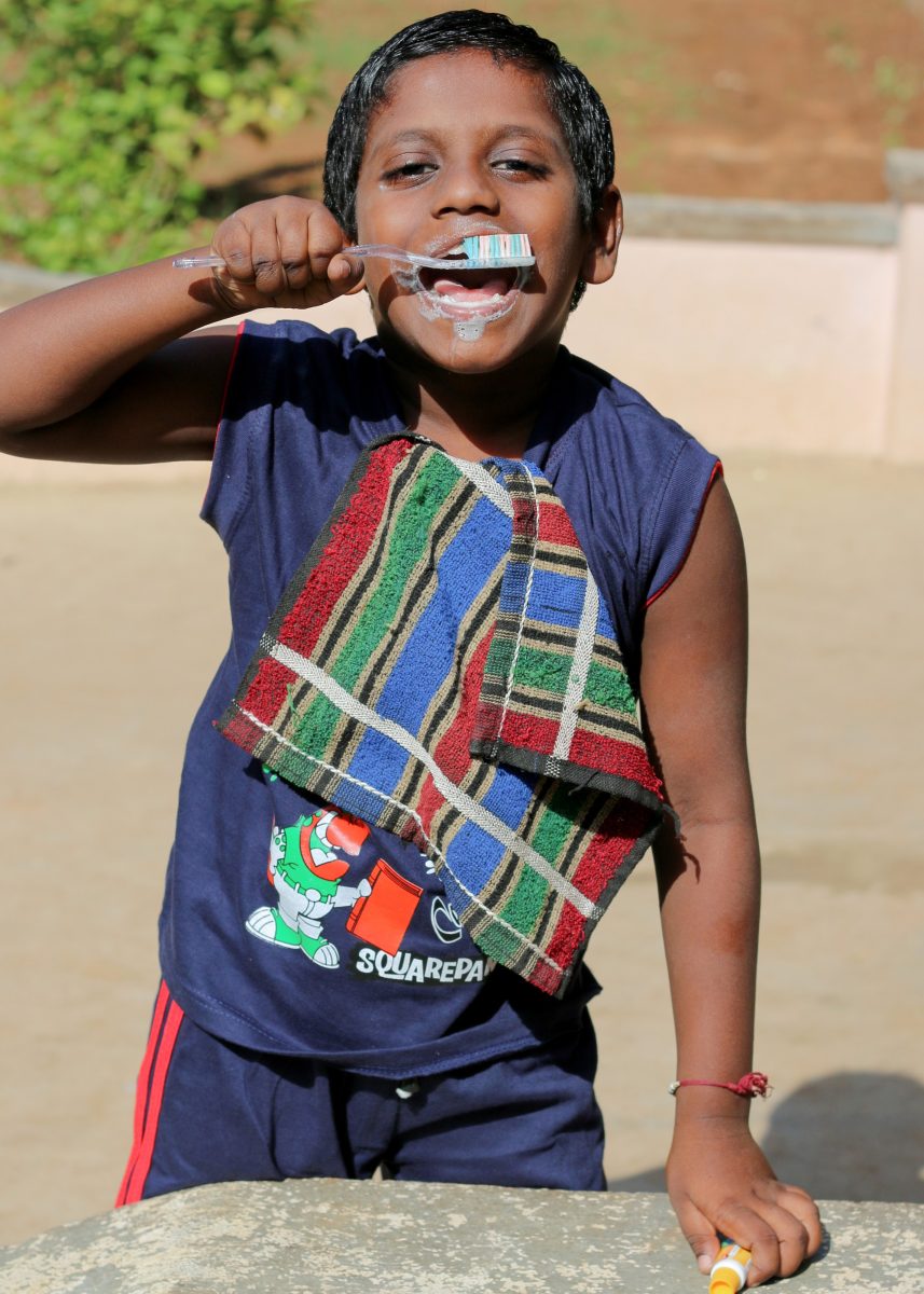 This little lad from out Nellore site in India is giving his pearly whites a thorough brushing. When young children first start using a toothbrush on their own, things can get a little messy. At our sites, sometimes even older children have never used a toothbrush before receiving one as a gift or through sponsorship. Luckily, someone had the foresight to prepare this fella with a cloth to protect his shirt from all of that foamy toothpaste until he gets the hang of it!