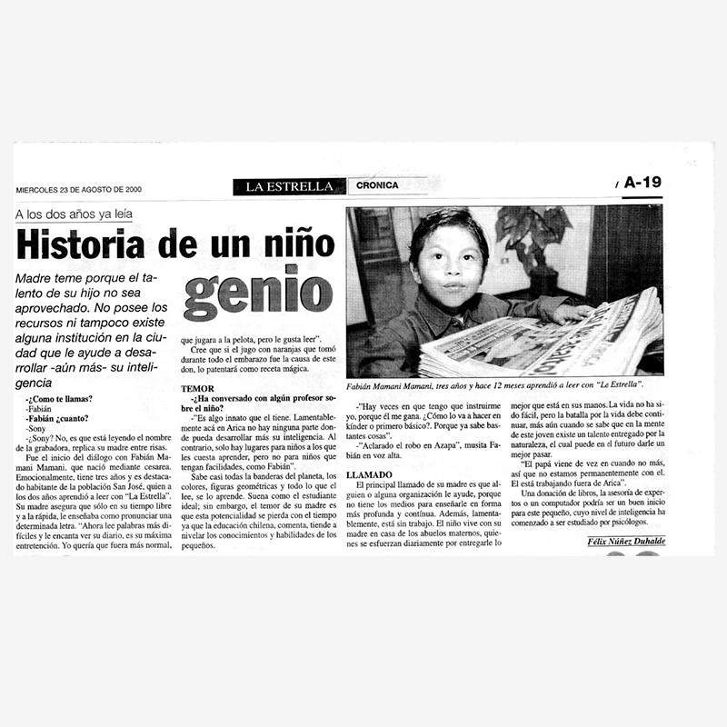 While most kids learned to walk at age two, Fabian learned to read. This whiz-kid from near our Arica site in Chile was even featured in the news at just two years old and learned English at 10.